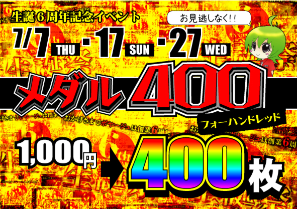 誠にありがとうございます!! 多くのお客様に喜んで頂ける店舗創りを目指してスタッフ一同ガンバリます! そしてそして、お客様に感謝を込めまして、今月7の付く日は「メダルスリーハンドレッド」ではなく・・・ 「メダルフォーハンドレッド」 プラス100枚の計400枚にてイベント実施いたします! 是非、ご利用くださいませ! また、プライズはオール100円設定にて営業中~ ワンピース景品を手に入れるチャンス。 そして、サッパリ話がかわりますが、ボヤージュ隣のらーめん店「本気うま亭」の新店が本日、寒川の町にオープンしましたー。 「本気うま亭倉見店」です。 HP⇒http://www.relafull.co.jp/raumen/majiumatei/topics/?n=66 只今オープニングキャンペーン実施中です! 7月10日まで一杯300円ですよ。 安っ! フードバトル5日間で10,000杯を販売した、「本気うま亭」の「てるてら~めん」! お近くの方、または近くにお立ち寄りの際などは是非ご利用くださいませ。 (本気うま亭倉見店の)スタッフ一同心よりお待ち申し上げます(代弁) ■本気うま倉見店 住所:神奈川県高座郡寒川町倉見1039 ジャパンニューアルファ倉見店の隣です。 営業時間:11時~22時 駐車場400台完備 2011.07.06 Wed 08:27:29 6周年生誕記念特別イベント開催!2011.07.01 Fri 15:49:05 7月でボヤージュは6周年! |