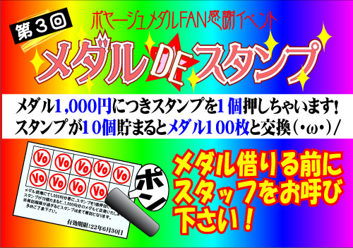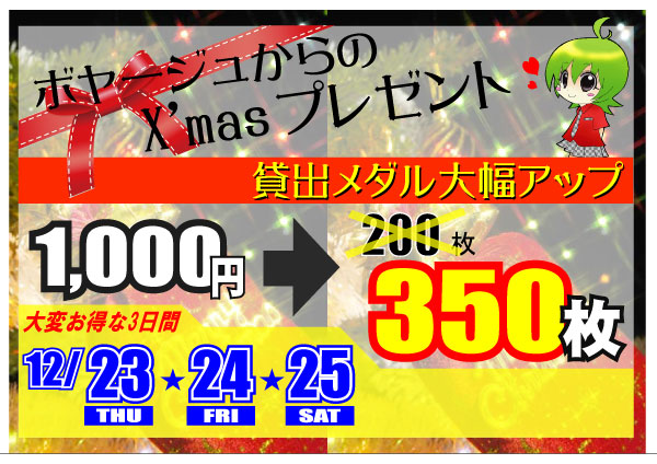ボヤージュではスタホ2におてい「1メダル2クレジット」キャンペーンを開催中なのですが、 馬主の皆様方より「1クレジット」要望が多数頂いておりましたので、 今月末まで、期間限定と致しまして、 半分の座席を「1メダル1クレジット」専用台にて開放中です!! 大漁獲得のチャンスです! お見逃しなく!! 2011.01.20 Thu 08:45:30 7の付く日をやっぱりお得!!2011.01.01 Sat 04:57:10 迎春2010.12.29 Wed 10:55:43 年末年始お得なイベント情報!!2010.12.23 Thu 16:08:00 クリスマス時別企画2010.09.01 Wed 21:03:43 メダルDEスタンプ開催 |