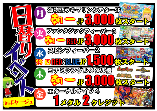 ボヤージュブログ神奈川県厚木市のゲームセンターボヤージュのスタッフブログPAGE | 1 2 3 4 | ADMIN | WRITE 2011.06.20 Mon 19:54:30 日替りイベント実施中!2011.06.07 Tue 09:52:30 スタンプ2倍デー開催2011.04.29 Fri 11:35:06 アミューズメント8店舗合同大抽選会2011.02.07 Mon 10:54:56 シニアサービス実施中2011.01.22 Sat 09:33:51 スタホ2大漁獲得のチャンスボヤージュ馬主の皆様こんにちは!!