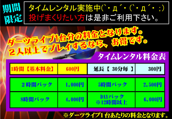 株式会社ダーツライブ主催の公式全国大会 「DARTSLIVE Area Championship 2010」の 店舗予選が当店ボヤージュでも行われる事となりました。 参加資格は「ダーツをこよなく愛する20歳以上のプレーヤー」 だそうです。 あら、未成年の方は残念。早く大人になるんだ。 ちなみに、今回よりレーティングによる参加条件のシバリはなくなってます。 日程は下記の通りとなります。 22年9月18日(土) 15:00 店内カウンターにて参加者様受付中です。 定員は32名までとなっており、定員になり次第受付終了となります。 ご了承ください。 実際32名も集まるとあんまり広くないので動けませんが・・・うーん。 ま、どうにかなるでしょう! PR 2010.09.02 Thu 08:39:31 ダーツカード選べますよん2010.08.04 Wed 10:44:16 ダーツタイムレンタル実施中! |
