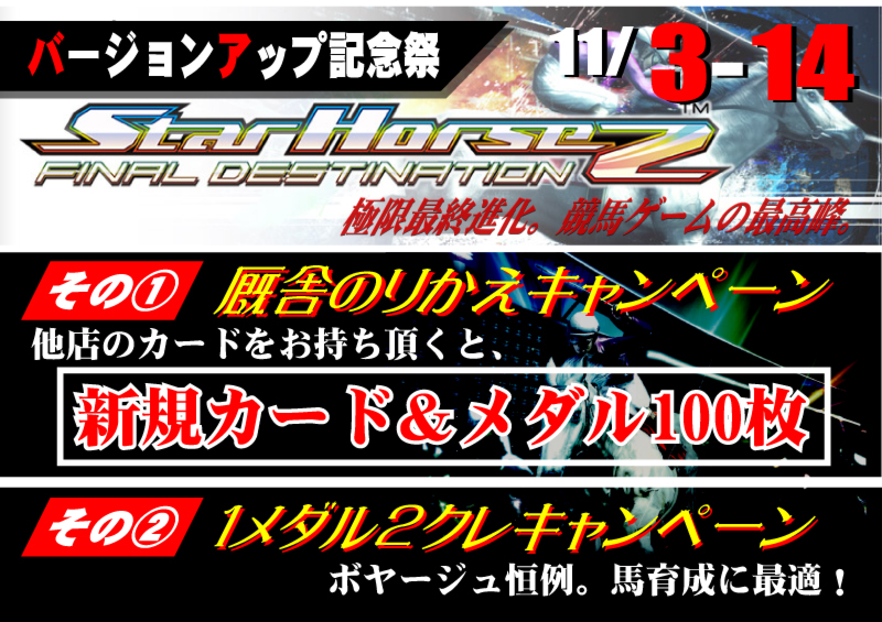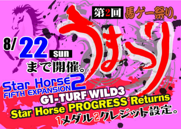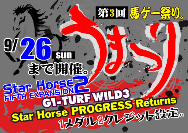 大好評となりました「スターホース2バージョンアップキャンペーン」を 期間延長いたします!! 期間はというと・・・ なんと今月末日まで! ,r'ニニニヾヽ、 //ニニニヽ、 ("´ ̄ ̄ヾ)) _____ ((/ ̄ ̄`゙`) | 、ィ_ノと)' / "\, 、/"\ (つ(_,,ア |! i| ` イ_/ / (‐-、)、 ,(,-‐ ) \. \_Y |! .ヽ、 ' ( / `゙(__人__)'" \ / ` / \ \l i| |! l/ / l|l \ \ 、i|,/⌒ヾ、|!;, / / |l \ ヾ `ー一'´ ィ / i ヾ、 ``"´ / ゚ |! Y ィ |! 。 ,. ' 、/ ヾ ´ ’ ` ゚, i! `| ゜、l! i|!; ゚ ゜ 。 ヾ从ソヾ、, ;;ソ'人゚;,ィ~;;へ、ィヘ;;´ンy∧从/∨ゞ〆´ ,., _..〆 ..:::ソ ..:_::ノ .::j .:::ノ`ソ´::ゝ .::::...ヽ _.:::` 1メダル2クレジット継続のこの機会に是非スタホ2で遊んでみてください! 2010.11.03 Wed 15:25:03 スタホ2キャンペーン情報!2010.10.28 Thu 11:13:40 スタホ2最新作好評稼働中!2010.10.23 Sat 16:01:36 スタホ2最新作登場まであと少し!!2010.10.05 Tue 16:47:12 スタホプログレス強化月間10月度強化機種といたしまして、